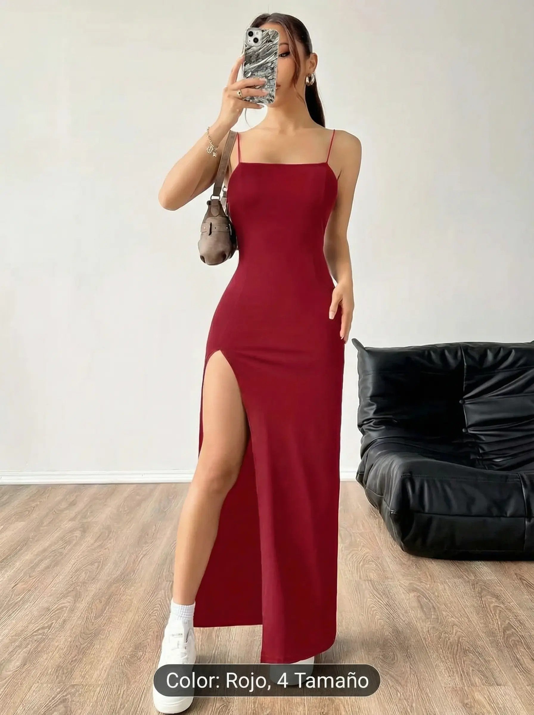 Vestido largo ajustado sexy de mujer con gran abertura - Color sólido, tirantes finos, diseño de gran abertura, ajustado a... Leer más...